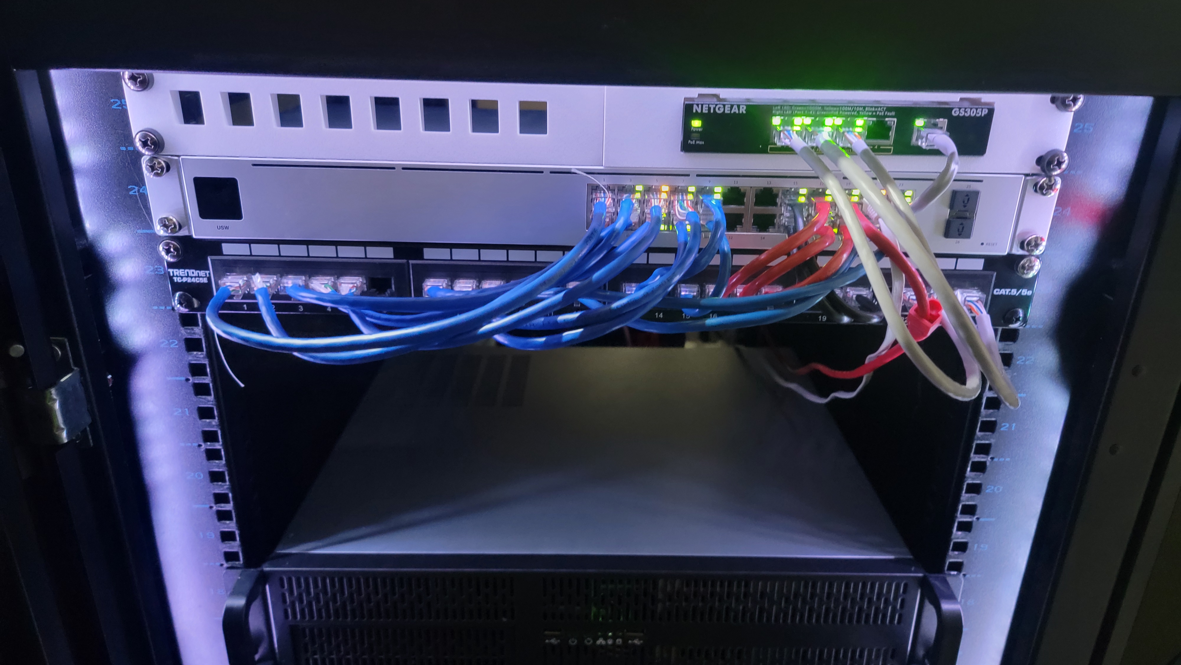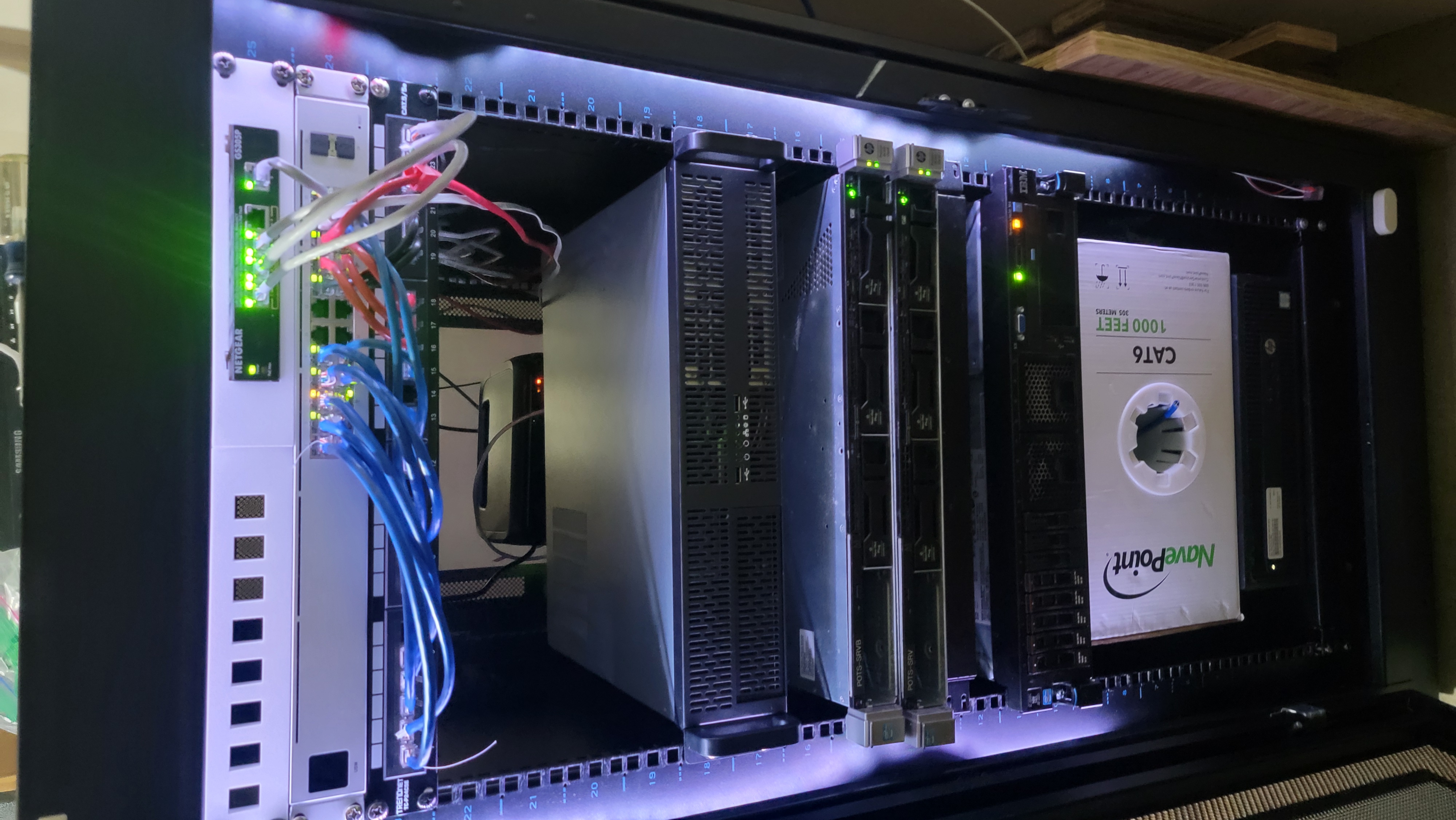 To move my servers off the floor, I had to move 8 ethernet cables to another room, and I had keystones to pass the cables through to the other side of the wall. I pulled the 8 cables through a previous hole, which has a box where I connected all 8 cables. On the other side of the wall I have my server rack, which now on the wall there's ethernet ports that lead to that box. My server rack has a patch panel, which all the ethernet is connected to then to my cisco switch.
